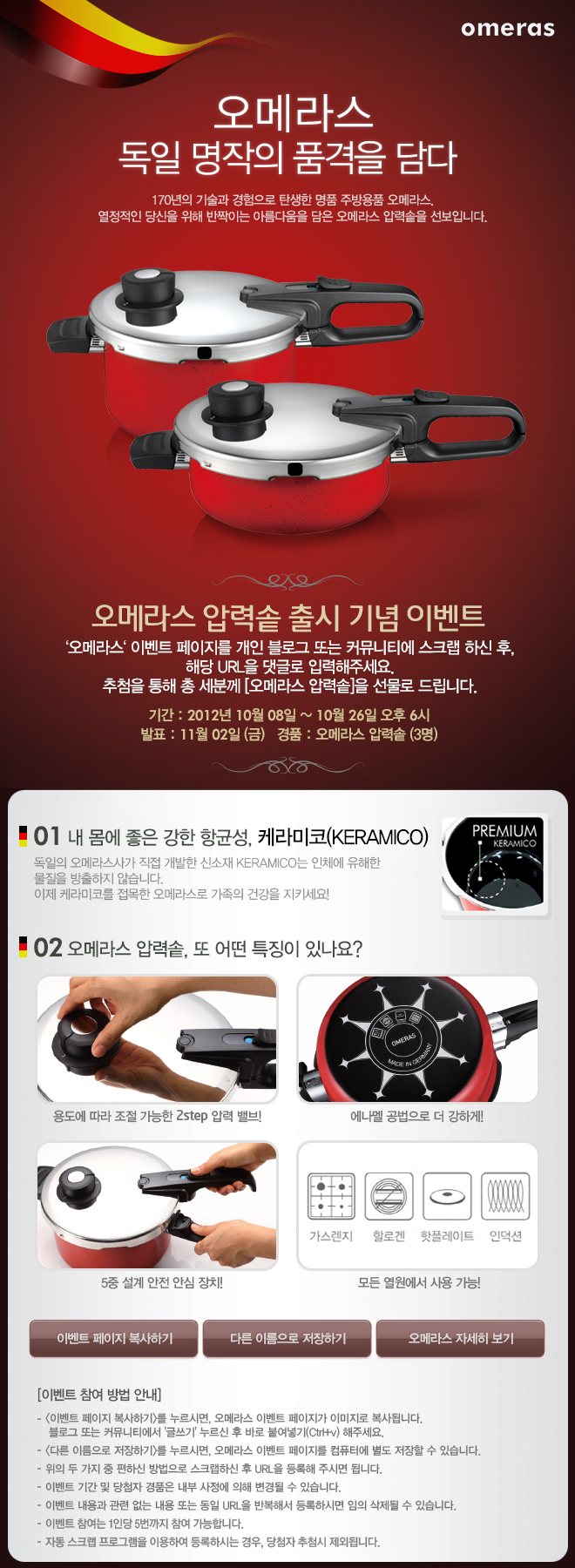 | http://blog.daum.net/lovelyms76/859 요리 블로그를 운영하고 있어서 더욱 민감한 솥과 그릇의 선택에서 인체에 유해한 물질을 방출하지 않는 오메라스의 만남은 그 자체가 설레임입니다. 결혼전부터 압력솥을 이용해 다양한 요리를 하시는 친정엄마의 모습을 보아서 저역시 압력솥을 이용해 다양한 요리를 하고 있습니다. 그래서, 독일 명작의 품격을 담은 오메라스 압력솥을 이용해 꼭 요리를 해보고 싶습니다.모든 열원에서 사용가능한 점부터 용도에 따라 조절 가능한 압력 밸브까지 사용하는 주부 입장에서 설계된 오메라스 압력솥 요리하는 사람으로서 꼭 만나보고 싶습니다. 그리고, 이렇게 행복한 이벤트 열어주셔서 감사드립니다. |