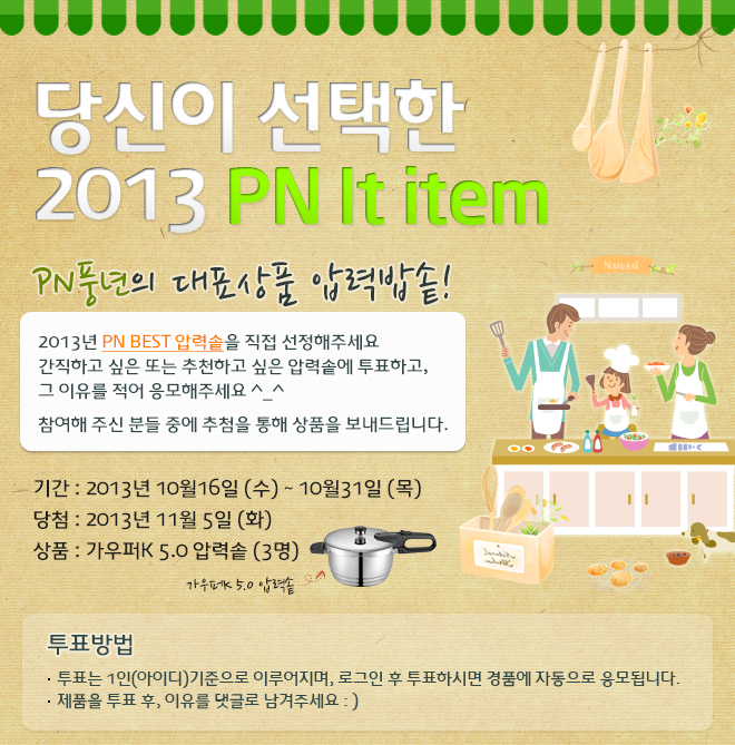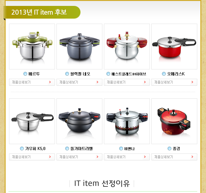풍년 압력솥이야말로 압력솥의 원조로서 최고의 제품들로 소비자를 만족시키고 있어서 어느 제품하나를 선택하여 투표를 해야 한다는게 힘든일이지만.. 그래도 어느제품 하나를 선택하여 투표해야 한다면... 저는 [가우퍼K5.0]을 선택하겠습니다.^^