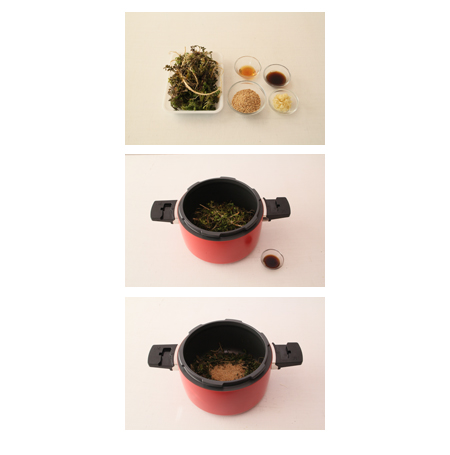 02. 압력솥에 01에서 준비한 냉이와 국간장을 넣고 가열을 시작해줍니다.