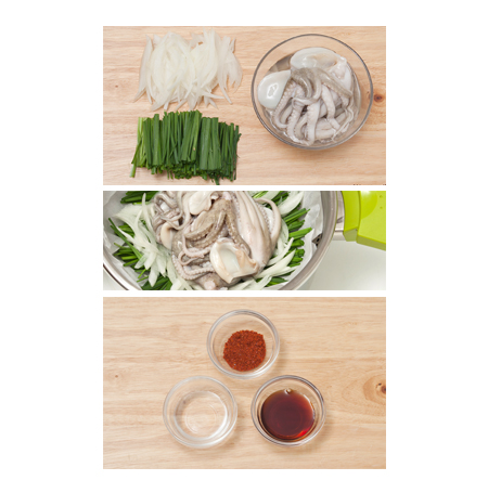 주꾸미 12마리, 부추 50g, 양파 1/2개, 물 1컵