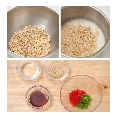 무말랭이 50g, 쌀 2컵, 물 2컵, 청홍고추 1개씩, 통깨 1큰술, 조선간장 2큰술, 물 2큰술