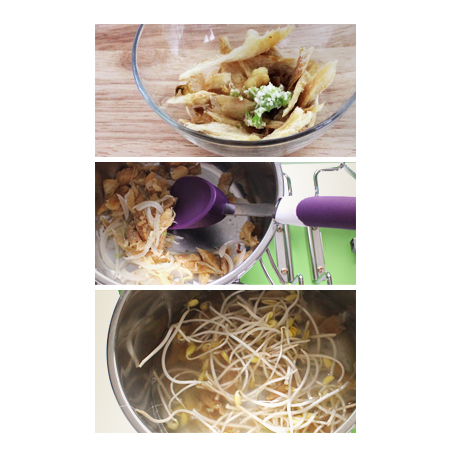 *TIP 메티오닌이 풍부한 북어와 아스파라긴산이 풍부한 콩나물로 야외생활의 피로를 말끔히 날려 버릴 수 있어요. 북어채에 밑간을 하여 볶아야 구수한 맛이 빨리 우러나지요.