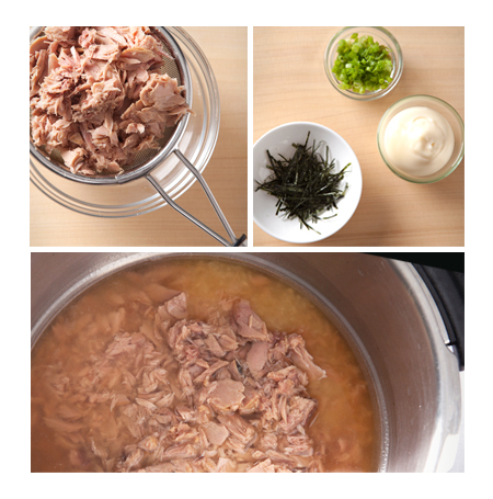 캔참치 1캔(210g), 쪽파 2대, 불린 쌀 3컵, 물 2+2/3컵, 간장, 청주 2큰술씩,