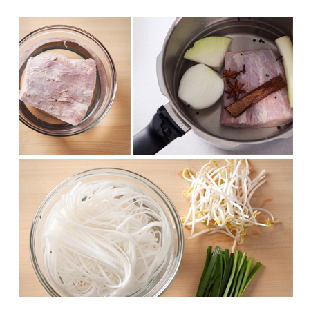 [육수] 쇠고기 양지머리 250g, 무 3cm 크기 1토막, 양파 1/2개, 대파 1/2대, 팔각 2개, 정향 7~8알, 통후추 15알, 계피 2cm 1토막, 피쉬소스 4큰술, 청주 2큰술, 설탕 1/2작은술, 물 1.2리터, 소금 약간
