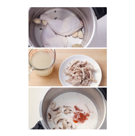 01. 압력솥에 껍질을 적당히 벗긴 닭다리와 마늘, 월계수잎, 통후추, 화이트와인을 넣고 물을 부어준다.