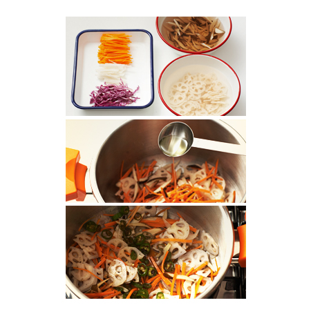 04. 압력솥에 식용유 1큰술을 두르고 연근, 우엉, 당근을 넣어 고루 섞어준다.