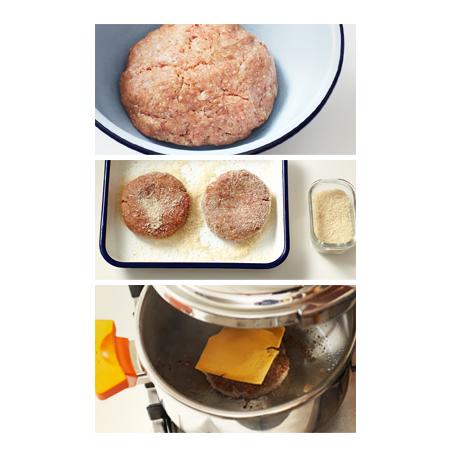 다진 쇠고기 450g, 양파 80g, 식빵 1½쪽, 달걀 3큰술, 마늘 1개, 소금 1작은술, 넛멕 1/4작은술, 후춧가루 약간, 체다치즈 3~4장, 햄버거빵, 양파, 토마토, 양상추 등