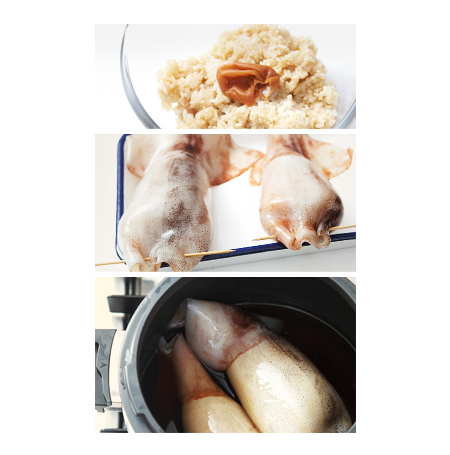 오징어 중간크기 2마리, 찹쌀밥 400g, 쯔유3큰술, 우메보시2개(없으면 매실청1큰술)