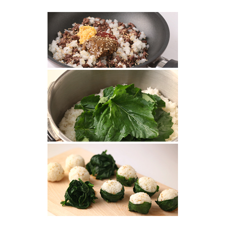06. 양념된 밥은 작은 볼모양으로 만든 후 참나물로 감싸준다.