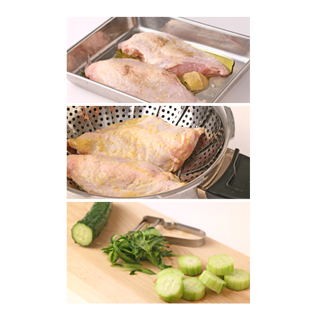 02. 절여진 닭을 압력솥에 넣은 후 약한 불로 30 분 동안 쪄준다.