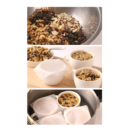 04. 버터를 골고루 바른 푸딩볼에 모든 재료를 넣고 종이호일을 덮는다.