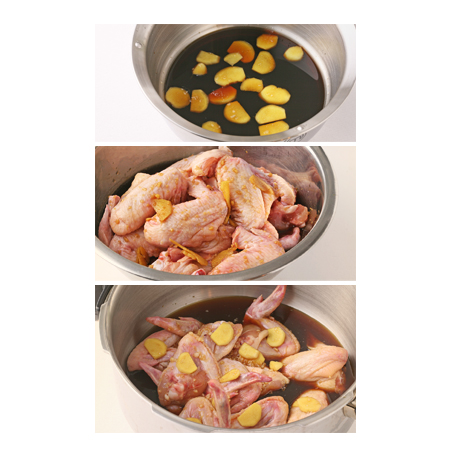 03. 절여진 닭은 양념소스와 함께 압력솥에 넣어 뚜껑을 닫은 후 20분 동안 찐다.