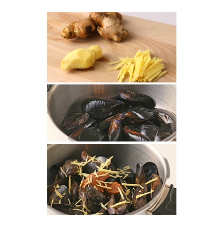 02. 수염을 때고 깨끗이 씻은 홍합과 미림, 물을 압력솥에 넣어 뚜껑을 닫은 후 8분 동안 쪄준다.