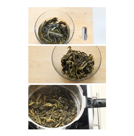 03. 압력솥에 식용유를 두르고 02.의 시래기를 모두 넣어 3분간 볶아준다.