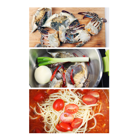 06. 꽃게 육수와 게살, 토마토소스를 압력솥에 넣어 뚜껑을 열고 가열한다. 끓기 시작하면 방울토마토와 면을 넣고 가열 한다.
