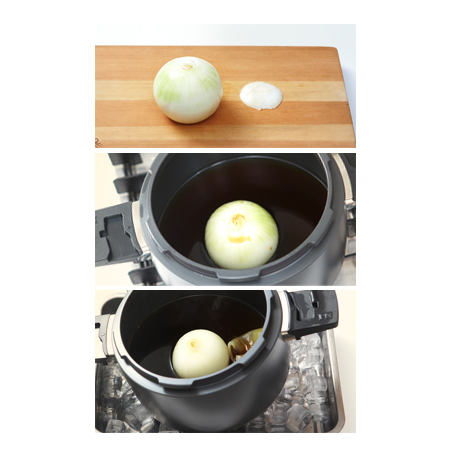 01. 양파는 뿌리부분이 수평이 되도록 한번 썬다.